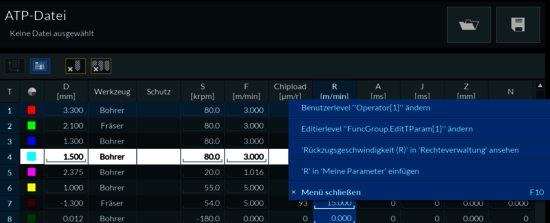 Auch einzelne Spalten der Werkzeugtabellen können per Rechtsklick für unterschiedliche Benutzerlevel freigegeben oder eingeschränkt werden. Zum Beispiel ist für die Rückzugsgeschwindigkeit in der Parametertabelle sowohl der Benutzerlevel als auch der Editierlevel einstellbar. Zusätzlich ist es möglich, von diesen Spalten in den Tabellen in die Rechteverwaltung im Konfigurator zu springen.