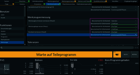 Im Konfigurator befindet sich die umfangreiche Rechteverwaltung. Einstellbar sind hier die Benutzerlevel für den generellen Zugang zur CNC-Steuerung. Diese Zugangsberechtigungen steuern die sichtbaren Inhalte für den Benutzer auf der Benutzeroberfläche und den Zugriff auf Funktionen. Für jeden einzelnen CNC-Befehl kann ein Benutzerlevel und speziell ein Benutzerlevel für die Abarbeitung festgelegt werden. Im Bereich „Programm“ sind Benutzerlevel für die Sichtbarkeit und Editierbarkeit von spezifischen Funktionen einstellbar, wie zum Beispiel für die Freie Bereichsauswahl oder für das Verstiften. Dies gilt auch für sämtliche Werkzeug-Teilfunktionen wie der Werkzeugvermessung, Konturreinigung und den Durchmessertabellen.