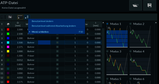Neu ist die Editierbarkeit des Benutzerlevels direkt und schnell an Buttons mit Lösch-Funktionen auf den Werkzeugseiten. Mit einem Rechtsklick auf die Buttons öffnet sich ein Dialog mit der Auswahlmöglichkeit „Benutzerlevel ändern“ und „Benutzerlevel während der Abarbeitung ändern“. Auf diese Weise kann schnell während der Produktion reagiert werden. Das Risiko von versehentlich gelöschten Daten der ATP-Datei sinkt, zum Beispiel der gesamten Durchmessertabelle oder der statischen Werkzeugparameter. Die Buttons mit Lösch-Funktionen sind schnell und einfach anhand ihrer orangen Umrandung erkennbar. Sie befinden sich auf den Funktionsleisten direkt über den Tabellen.